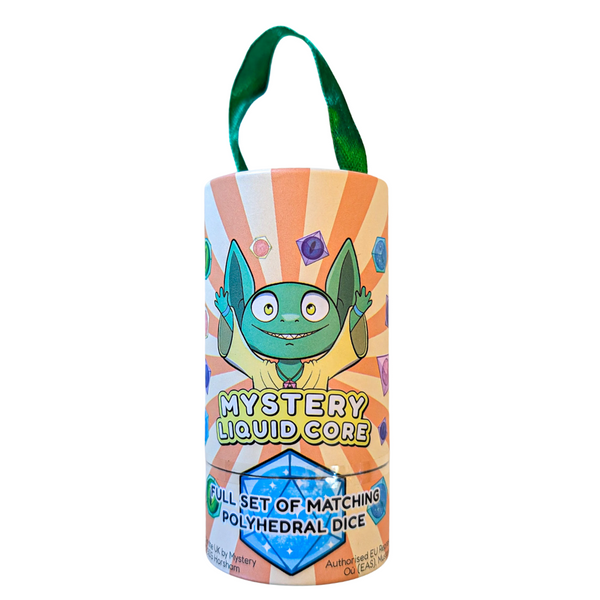 Metal Mystery Tube containing a full set of mystery liquid core dice