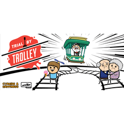 In Trial by Trolley, one player acts as the Trolley Operator and must choose where to send a murderous, out of control, trolley. Every other player at the table plays cards and argues in order to convince the operator to spare their lives and condemn everyone on the other track to a gruesome death-by-trolley.