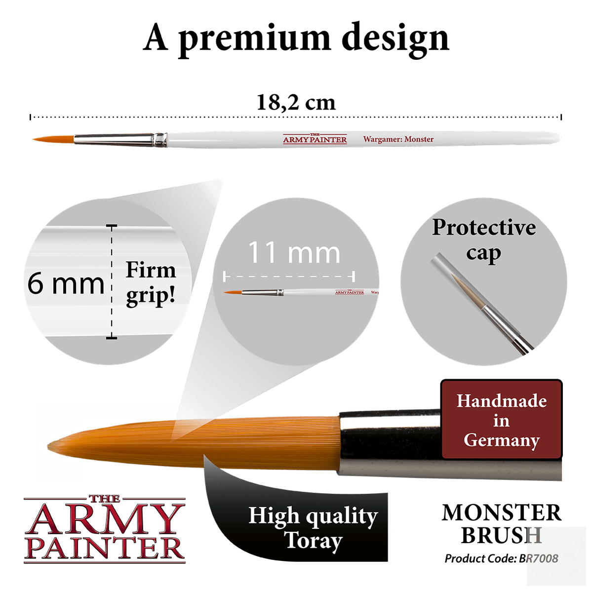 The Monster Brush has the right size for any larger models such as Dragons, Trolls, Warmachines and Vehicles.This brush is made from the finest Toray synthetic due to the fact that a sable brush of this size could potentially drown a miniature in paint - whereas the Toray releases the paint slower.